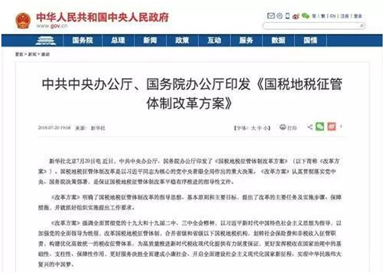 ????????7月20日,中共中央辦公廳、國務(wù)院辦公廳印發(fā)《國稅地稅征管體制改革方案》,明確從2019年1月1日起,將基本養(yǎng)老保險費、基本醫(yī)療保險費、失業(yè)保險費、工傷保險費、生育保險費等各項社會保險費交由稅務(wù)部門統(tǒng)一征收。