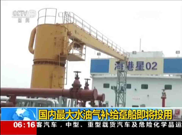 ????????2017年4月19日,中央電視臺新聞頻道朝聞天下欄目報道——江蘇海企港華燃氣股份有限公司自主建造的國內(nèi)最大水油氣加注躉船“海港星02”號即將在江蘇投運?!昂8坌?2”號加注躉船總投資約6100萬元,船長136米,配備2個250立方米的液化天然氣(LNG)儲罐和可儲存近2000噸柴油的油艙。