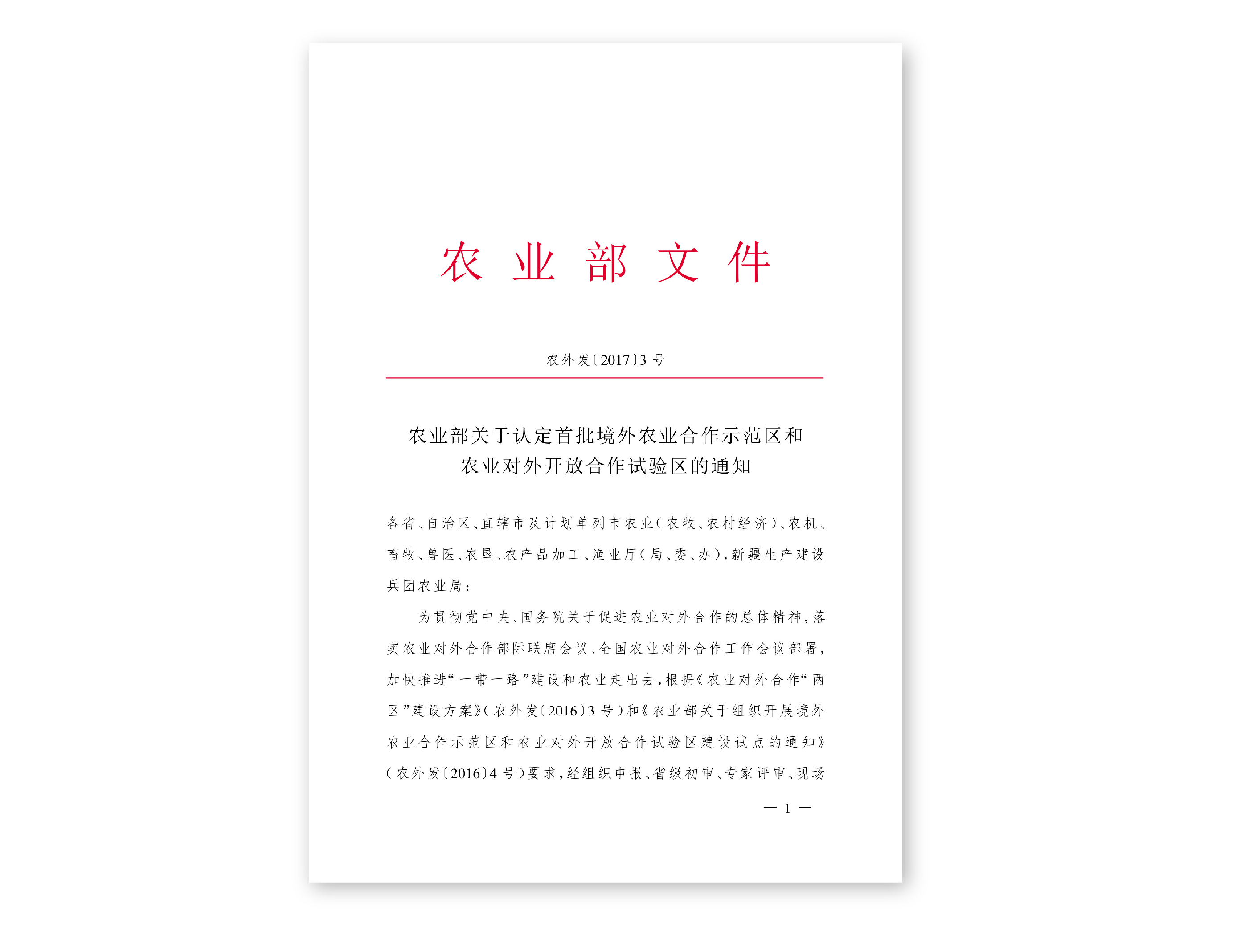 農(nóng)業(yè)部關(guān)于認(rèn)定首批境外農(nóng)業(yè)合作示范區(qū)和農(nóng)業(yè)對(duì)外開放合作試驗(yàn)區(qū)的通知